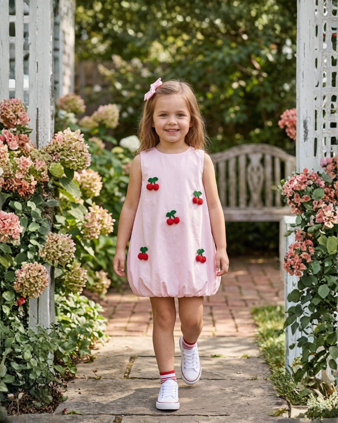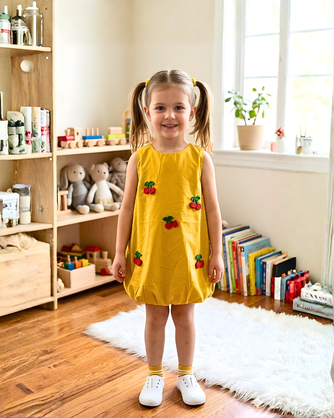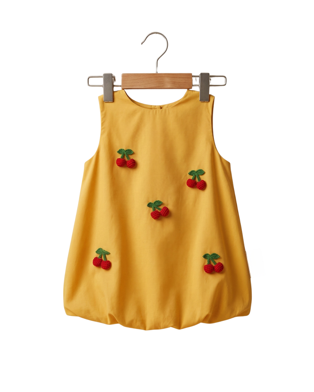Designed with adorable cherry appliqués scattered across the dress, this outfit brings a fun and playful vibe perfect for sunny days. The sleeveless design and breathable fabric keep your child cool and comfortable, while the bubble hem adds a trendy, voluminous look.