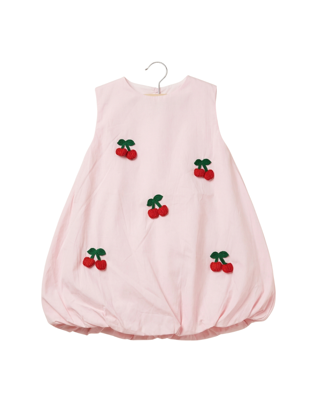 Design Highlights: Cute cherry appliqué detailing, sleeveless design, trendy bubble (balloon) hem, available in soft pastel shades