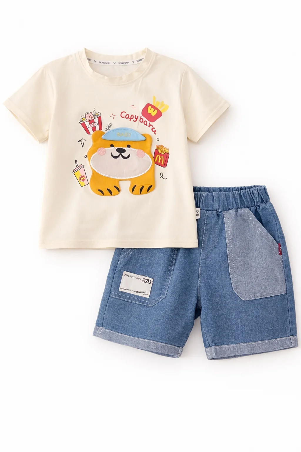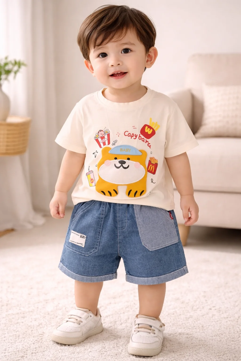 Playful, colorful, and full of personality — this adorable boys’ shorts set is designed for little explorers who love comfort and fun prints. Featuring a cute capybara cartoon graphic on a soft cotton tee paired with stylish denim shorts, this outfit is perfect for active toddlers and cheerful summer days.