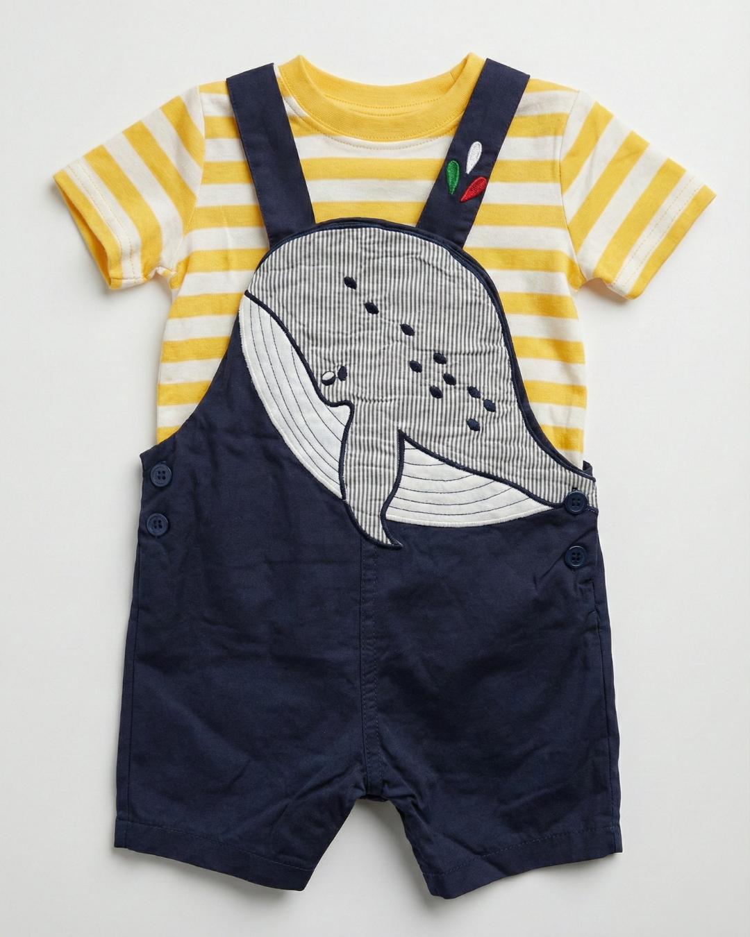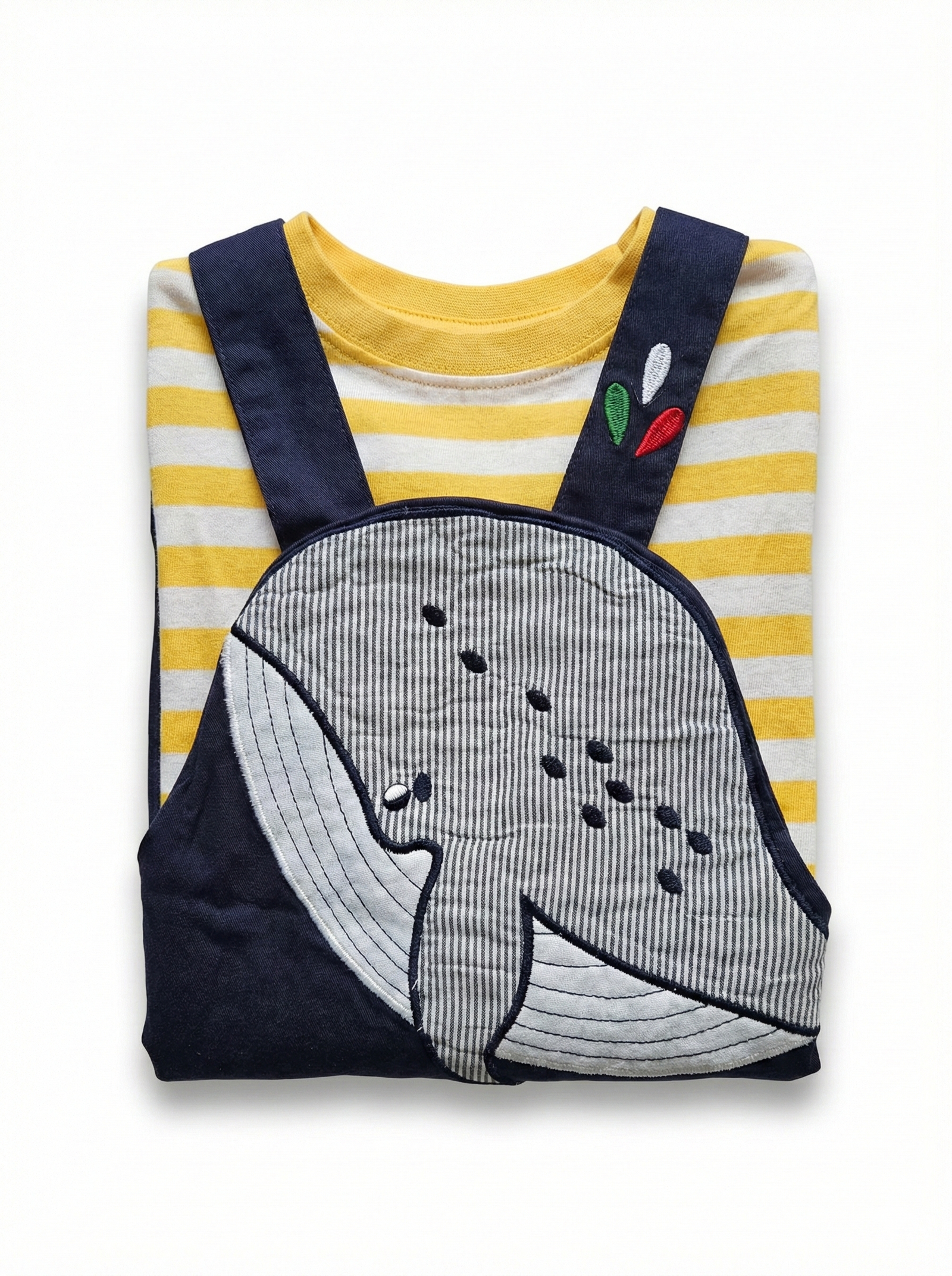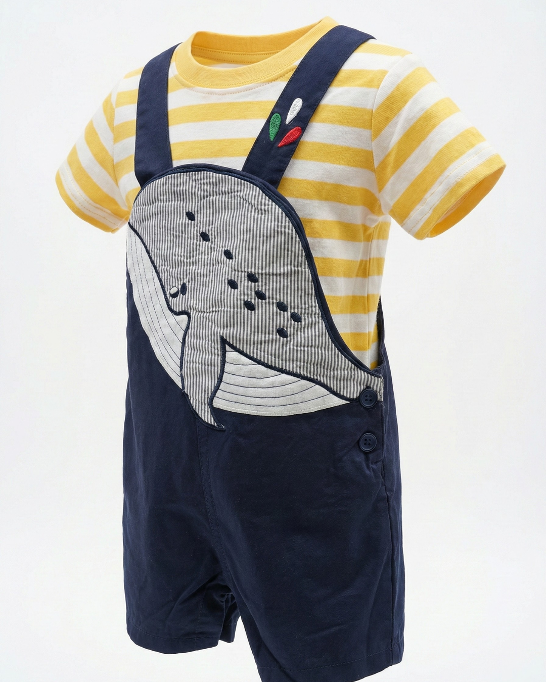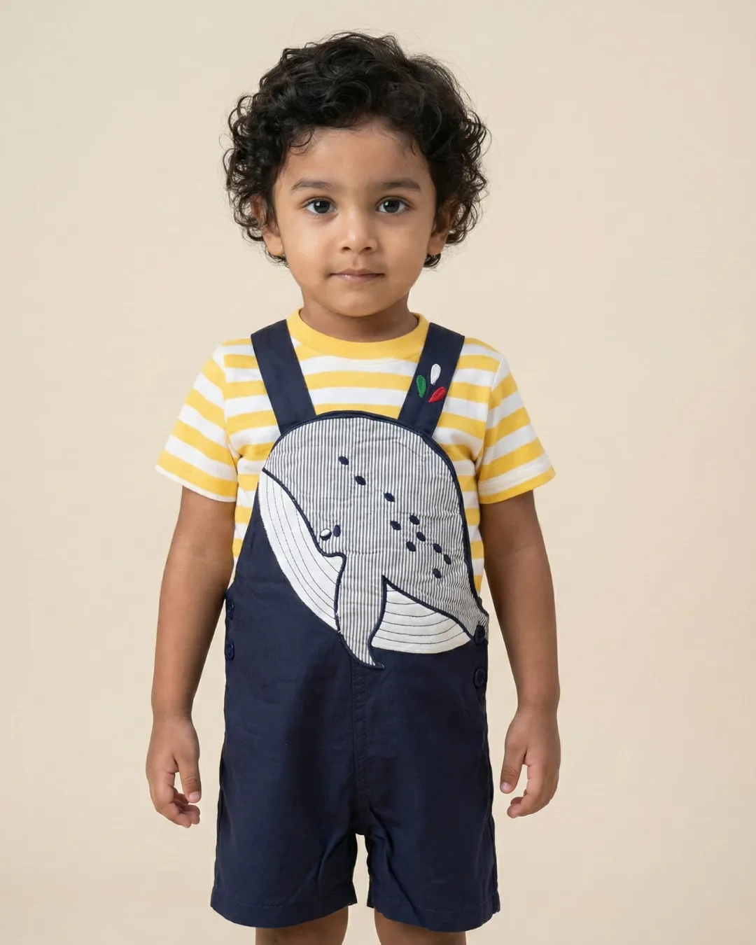 Designed for curious little explorers, this charming whale-themed outfit blends playful design with everyday comfort. The cheerful yellow striped tee pairs beautifully with a navy dungaree featuring an adorable whale applique — making it picture-perfect and parent-approved.