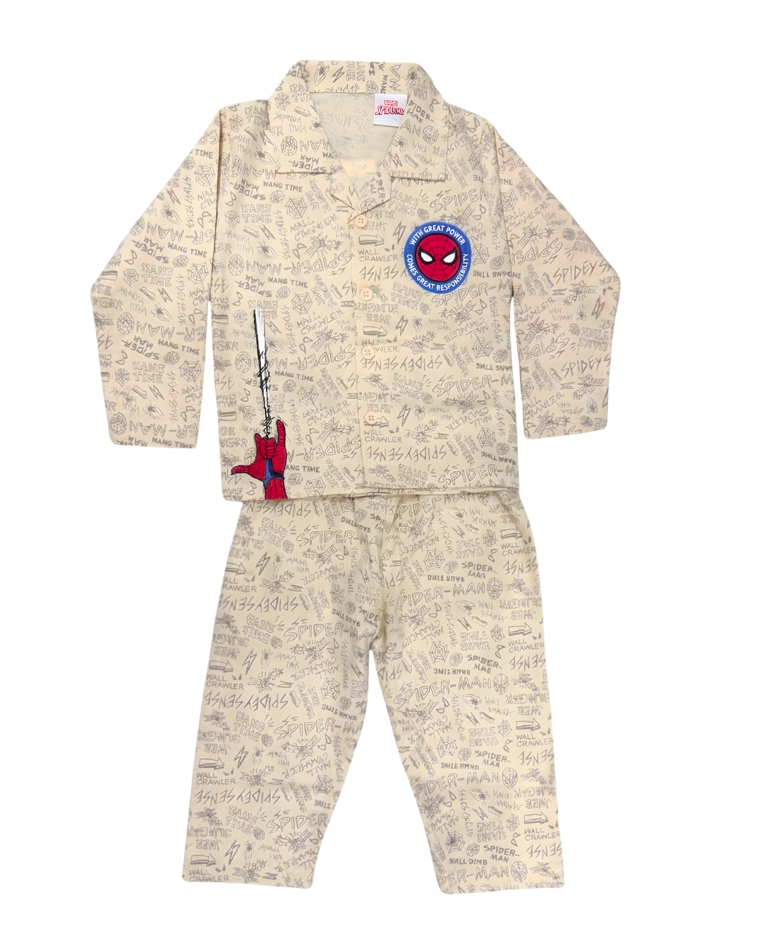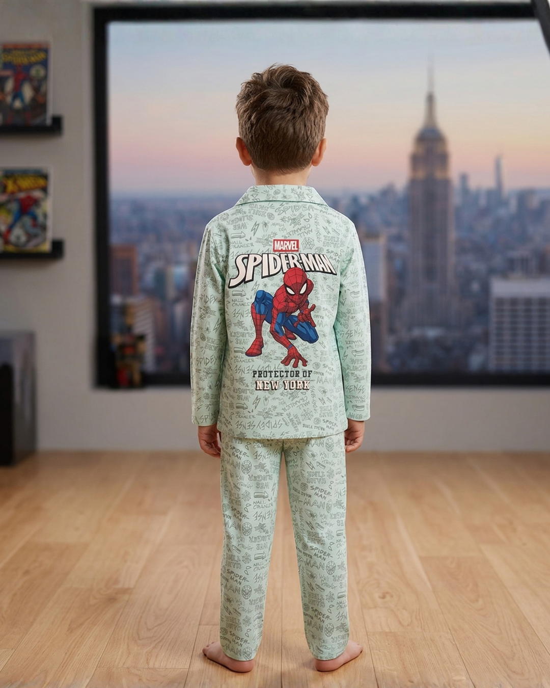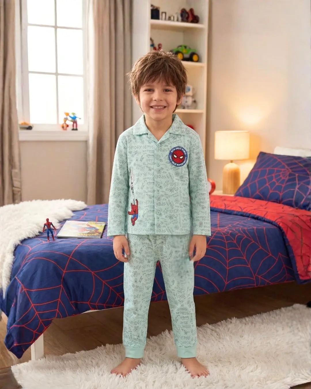 Design Highlights: Spider-themed all-over print, character patch detail, full sleeves, button-down shirt, elastic waistband pants