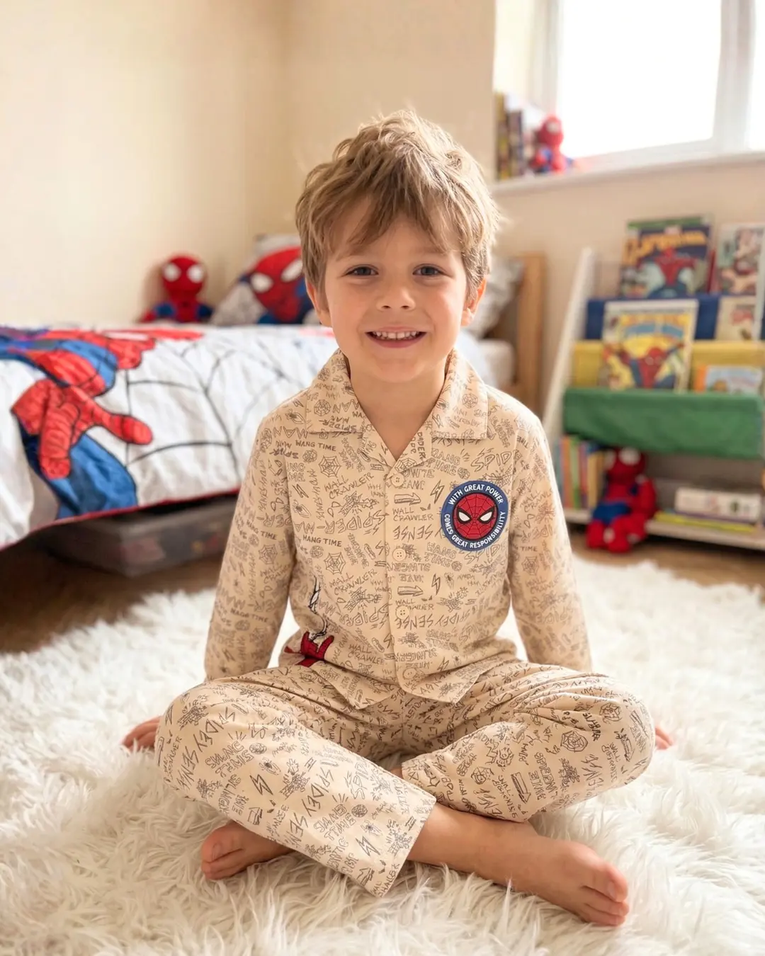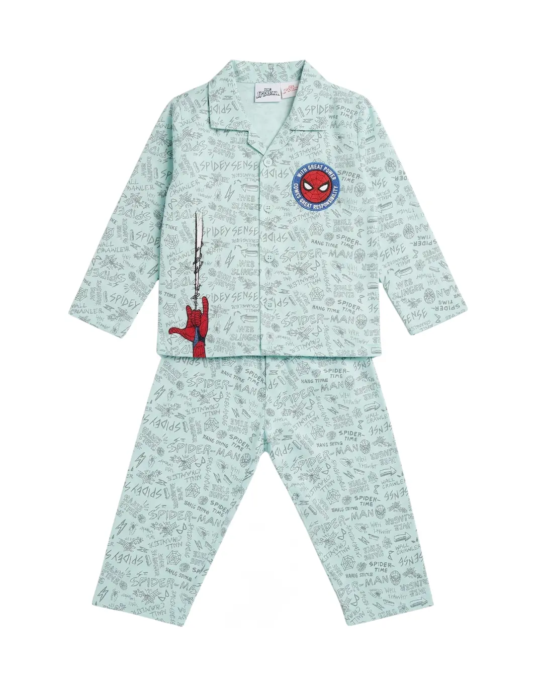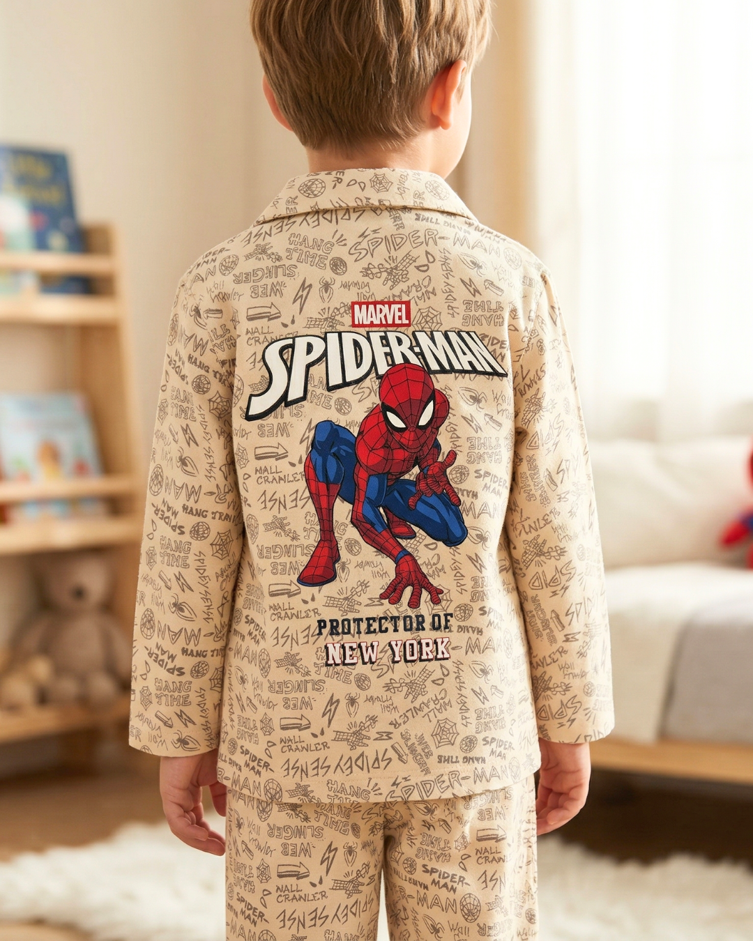 Design Highlights: Spider-themed all-over print, character patch detail, full sleeves, button-down shirt, elastic waistband pants