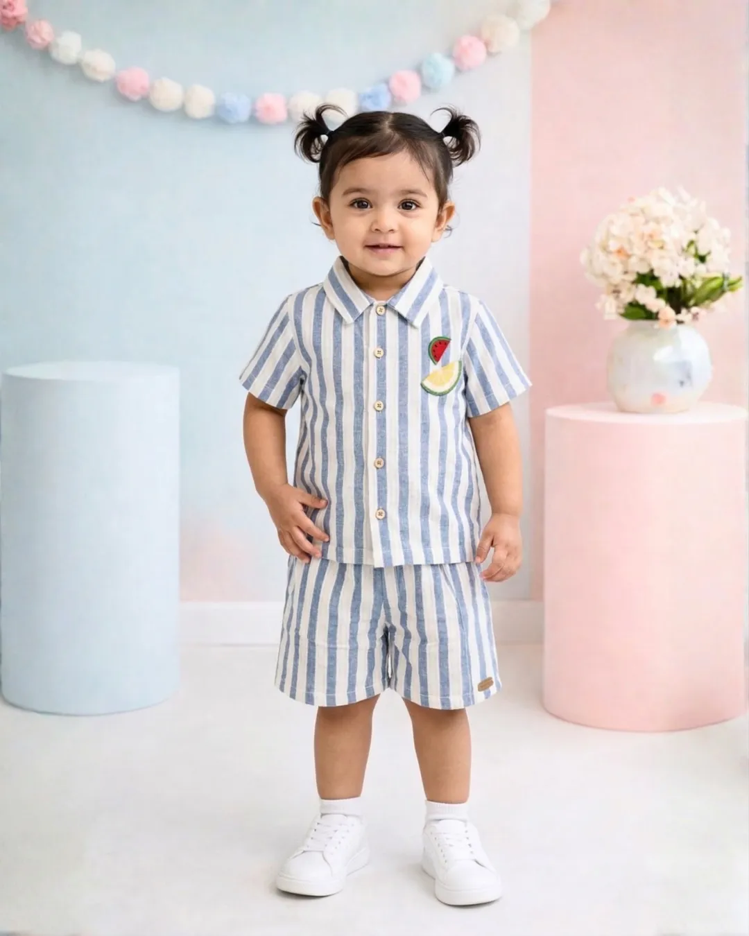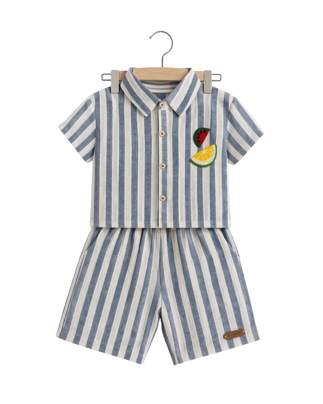 Fresh, breezy, and effortlessly cute—this striped co-ord set is made for sunny days and happy moments. Designed with soft vertical stripes and playful citrus patch detailing, it brings a light, cheerful vibe to your little one’s wardrobe.