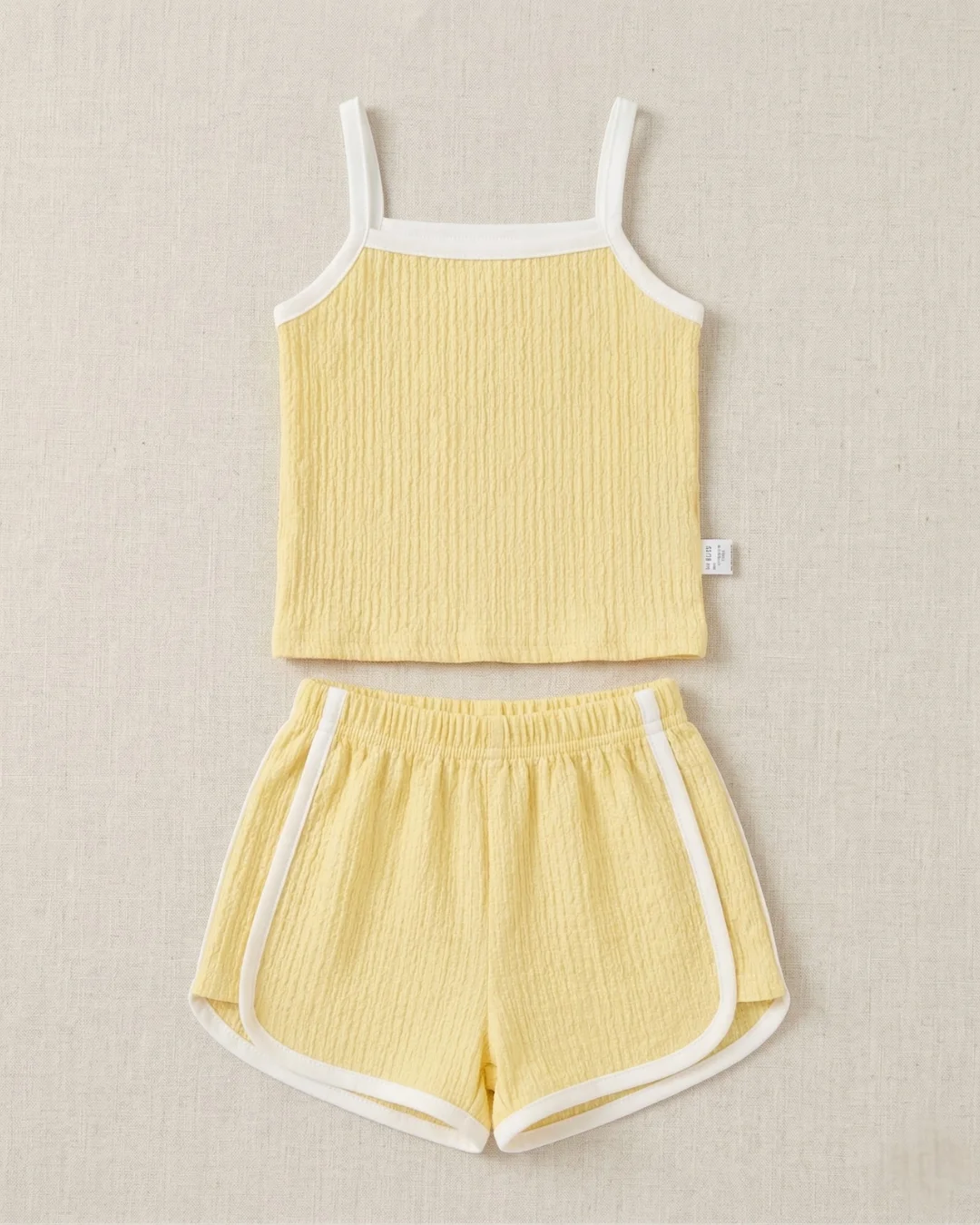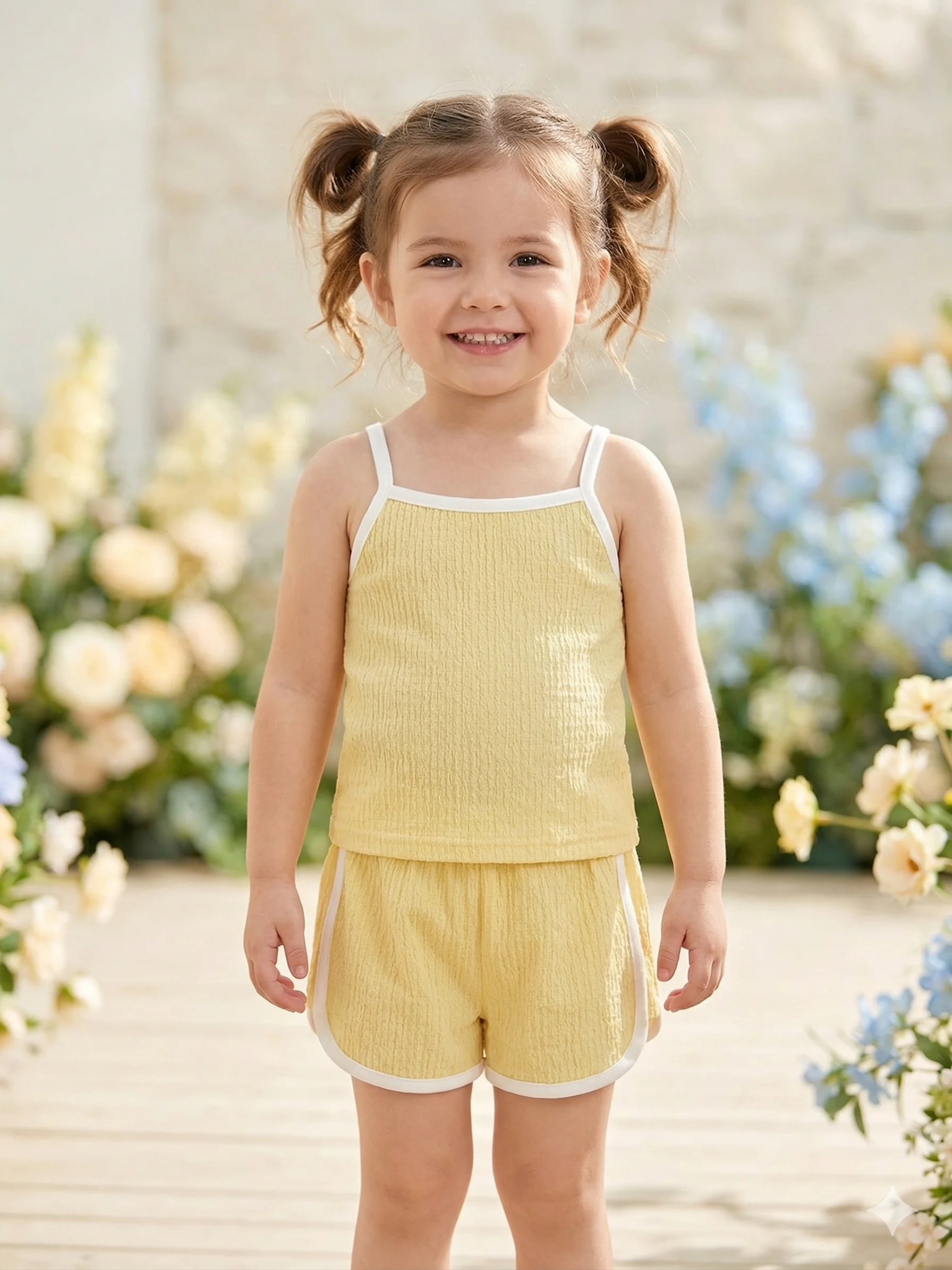 This adorable yellow co-ord set brings a cheerful summer vibe to your little girl’s wardrobe. Featuring a soft sleeveless camisole top paired with comfortable shorts, this outfit is designed for maximum comfort and easy movement during warm days.
