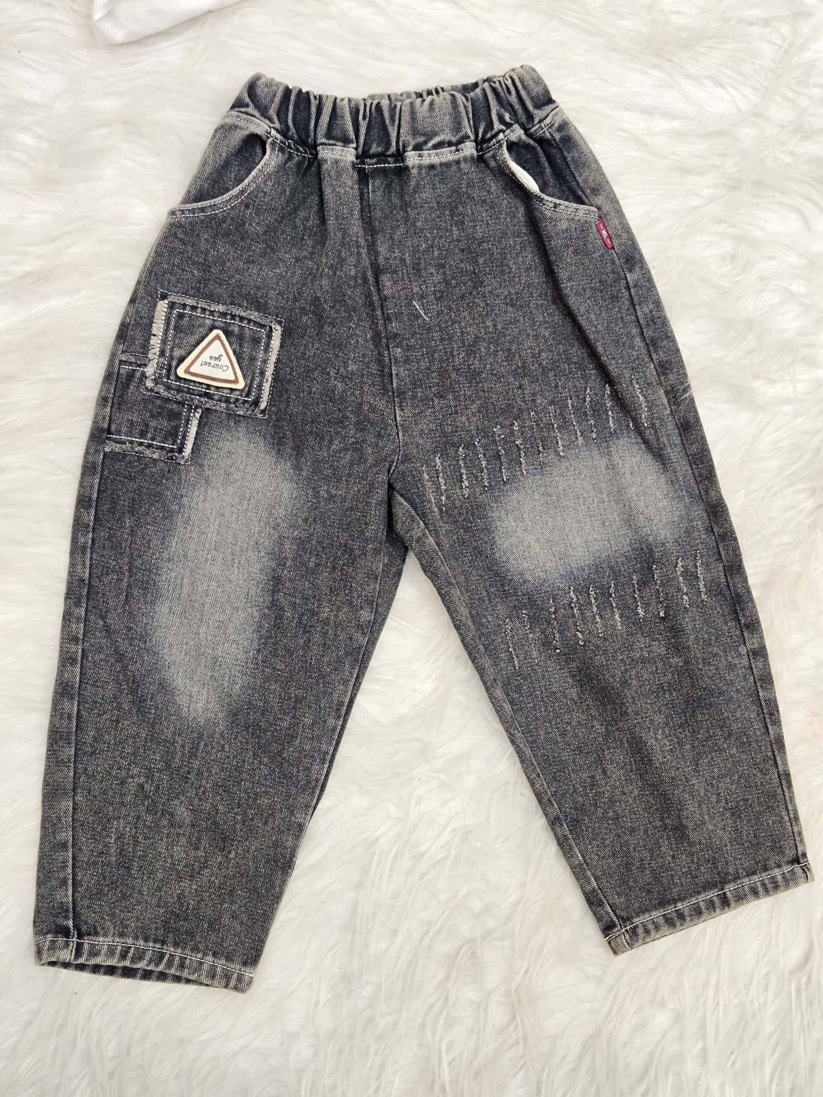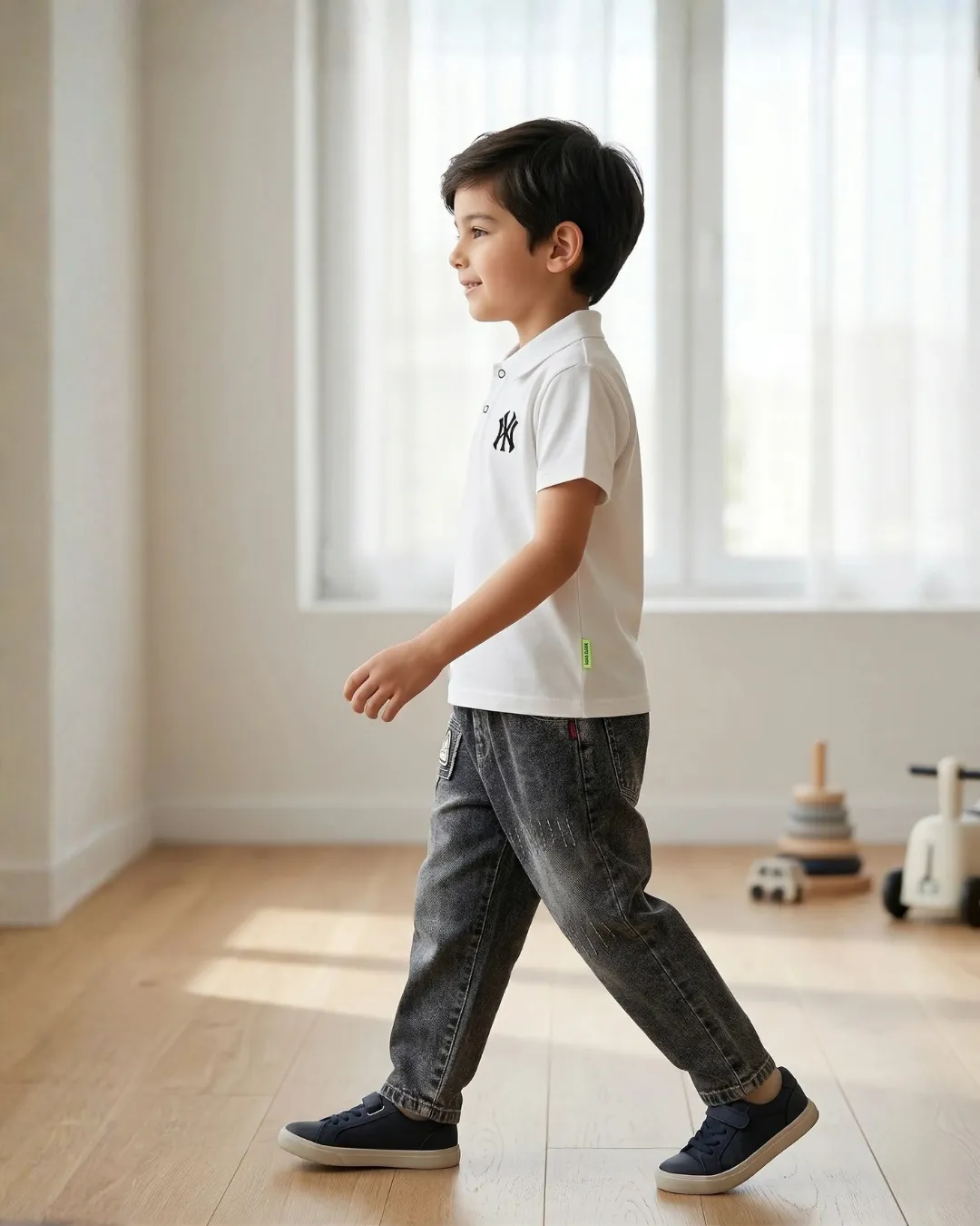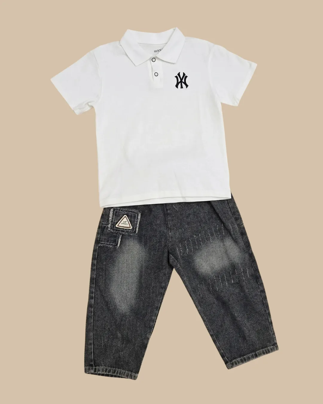 This stylish boys outfit features a classic white polo T-shirt paired with rugged denim jeans, creating a clean and modern look. The sporty logo polo adds a touch of sophistication, while the washed denim with pocket detailing brings a cool, casual vibe.